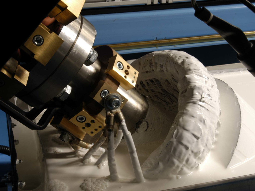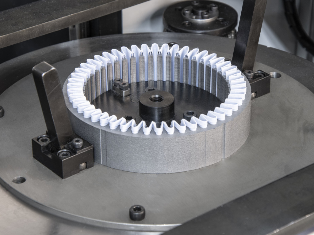 - Окончательное (финишное) автоматическое формование лобовых частей обмотки одновременно с двух торцов статора в трёх направлениях (3D) в последовательности, заложенной ПО оборудования, одновременно с прошивкой отверстий между пазами в лобовых частях обмотки в целях обеспечения беспрепятственного прохода бандажирующих игл при последующей операции бандажирования лобовых частей втянутых обмоток на специальном бандажирующем оборудовании;
