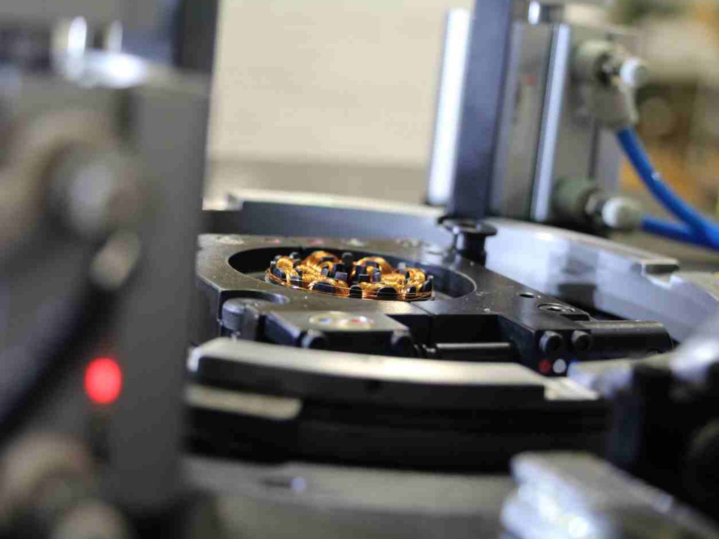 - Автоматическое втягивание комплектно сформированных катушечных групп обмоток статора в изолированные пазы статоров с обеспечением коэффициента заполнения пазов обмоточными проводами до 90% (для ЭД с классом энергоэффективности IE2 и IE3), параллельно с проведением операций автоматического изготовления и установки в пазы статоров изоляционных клиньев (изготовленных из рулонного материала) одновременно со втягиванием катушечных групп;