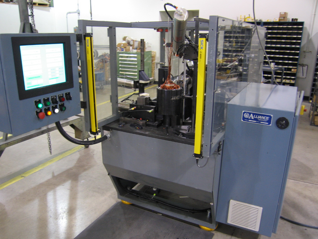 Состав установки: установка JOYAL типа G-3065, установка для охлаждения жидкости, устройство поглотитель смога, стол с подъемный гидравлический, комплект оснастки. На этой установке оператор выполняет соединение схемы обмоток и выводных концов статоров.